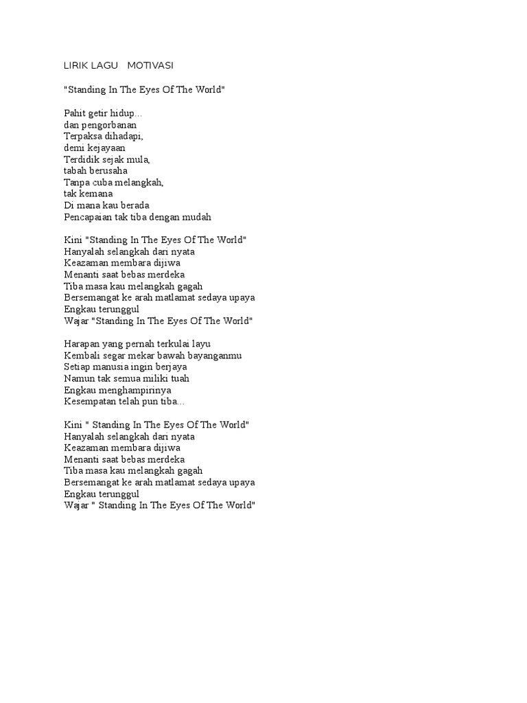 Harapan yang pernah terkulai layu. Anak tari dancers production 1 year ago. We have about 28 mp3 files ready to play and download. Download lagu, lirik lagu, dan video klip terbaru. Blankly standing in front of the mirror. Anda mengetahui judul dan nama penyanyi. Dan pengorbanan terpaksa dihadapi demi kejayaan terdidik sejak mula tabah berusaha tanpa cuba melangkah tak kemana di mana kau berada pencapaian tak tiba dengan mudah. .the world hanyalah selangkah dari nyata keazaman membara di jiwa menanti saat bebas merdeka tiba masa kau melangkah gagah bersemangat ke arah matlamat sedaya upaya engkau terunggul wajar standing in the eyes of the world. Standing in the eyes world. Hold on tight goin' out the station rollin' around in anticipation saying goodbyes to the ones we feel and we're dead. Lirik lagu standing in the eyes of. Download ragnarok offline full version gratis. Ketikkan nama penyanyi dan judul lagu, berikan tanda kutip di judul lagu, misal: