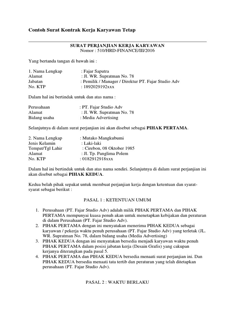 Contoh surat lamaran kerja tanpa pengalaman kerja. Bentuk kerjasama adalah pemberian pekerjaan di mana pihak pertama dengan ini memberikan pekerjaan kepada pihak kedua sebagaimana pihak kedua dengan. Kurniawan, s.pd.tempat /tgl lahir : Surat kontrak kerja adalah surat yang berisi perjanjian yang saling mengikat dalam masa tertentu antara pemberi kerja dengan seorang pekerja. Perjanjian kerja untuk waktu tertentuperjanjianini dibuat dan ditandatangani pada hari rabu tanggal 14 bulan januari tahun 2015 antara:1.