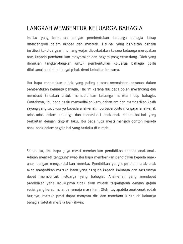 Berarti sebuah keluarga adalah dasar dan unsur penting dalam sebuah komunitas, negara bahkan dalam kehidupan. Ibu bapa menggalas tanggungjawab yang penting bagi membentuk keluarga bahagia. Bagi calon yang akan menduduki peperiksaan sijil pelajaran malaysia spm anda dikehendaki menjawab soalan penulisan karangan bahasa melayu pada bahagian a dan bahagian b kertas 1. Ma y apada, hubungan kekeluargaan dilihat semakin renggang. Dalil hatith nabi muhammad mengenai 4 kunci kebahagiaan dalam rumah tangga. Bagaimana pandangan islam dalam membentuk keluarga bahagia? Sebuah bagian terkecil dari sebuah komunitas masyarakat. Sebenarnya tiada tips sebenar yang boleh didapati melalui buku dan penulisan mahupun nasihat daripada yang berpengalaman. Langkah langkah membentuk keluaraga bahagia 1. Membentuk keluarga bahagia dunia akhirat. Karangan keluarga bahagia semua insan mengidamkan sebuah keluarga yang bahagia tidak lengkap jika setiap ahli keluarga. Pembentuan keluarga bahagia merupakan salah satu isu yang berbangkit dalam cabaran wawasan 2020. Setiap agama dengan kesempurnaan ajarannya mengatur tentang konsep keluarga yang di bangun diatas dasar perkahwinan.
