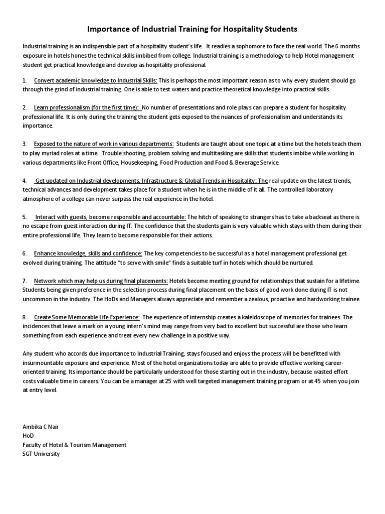 Study On Importance Of Industrial Training As A Part Of Hotel Management Education Curriculum As Perceived By Industry And Students Semantic Scholar from d3i71xaburhd42.cloudfront.net The importance of industrial training for students. We did not find results for: Check spelling or type a new query. Maybe you would like to learn more about one of these?